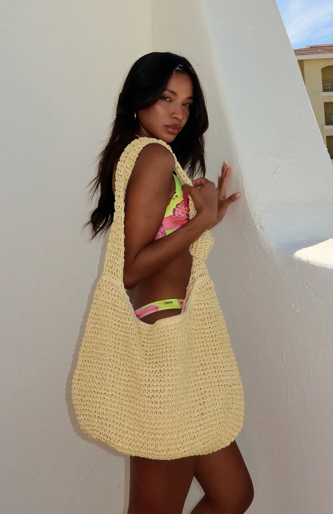 The Asher Shoulder Bag Natural is our new obsession! Features a large shoulder strap with knot detailing. top zipper closure and woven material. Pair with a sarong and bikinis for the perfect beach to bar look!