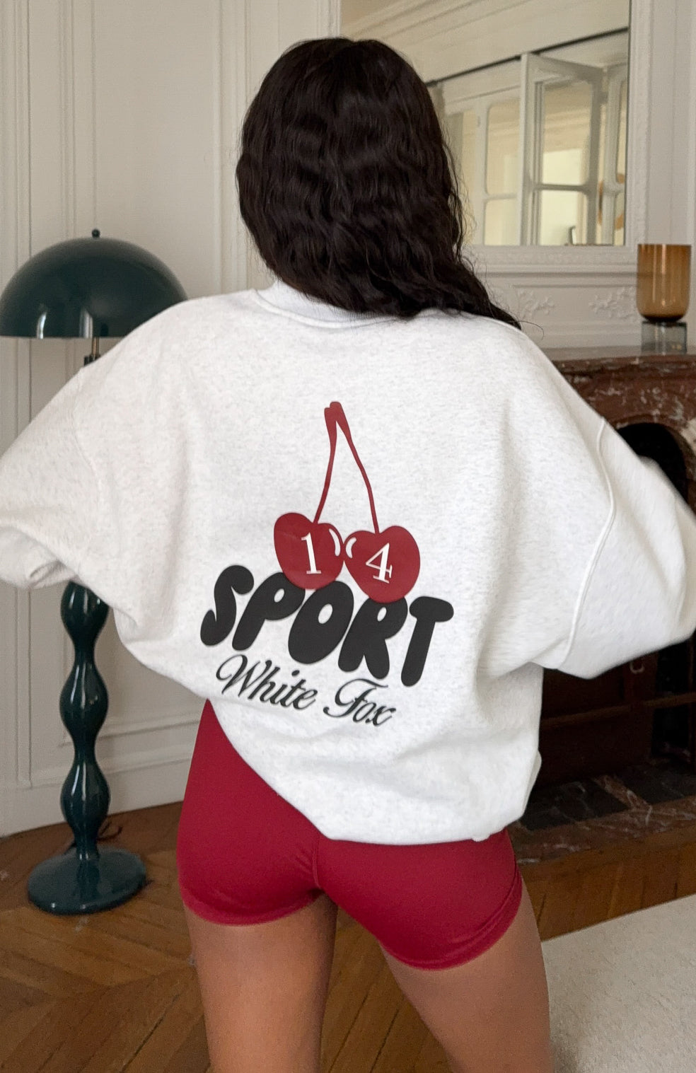 Loungewear. weather state of mind! The Club 14 Peyton Oversized Sweater Grey Marle is designed with a ribbed crew neckline. drop shoulders and ribbed hems. which round out an oversized silhouette. Featuring long sleeves and an unlined fleece interior. this sweater delivers a cozy feel. Finished with puff print Sport White Fox text side front. paired with an oversized cherry graphic centre back. Style with the Club 14 Peyton Bike Shorts for a cosy look.