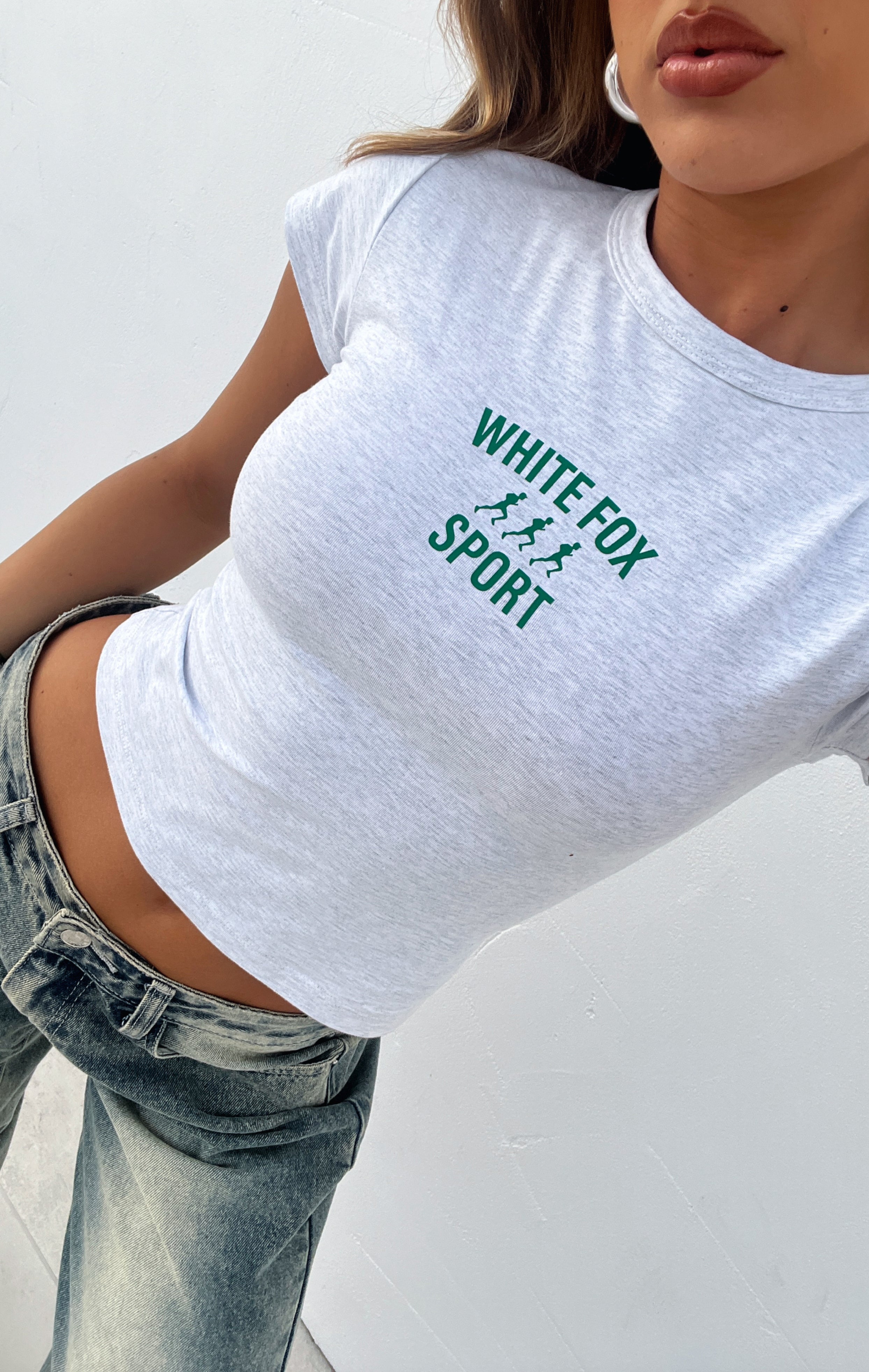 Upgrade your weekend casual fit' with the Stay Running Baby Tee Grey Marle. Features short sleeves. printed logo centre front. fitted and soft stretch fabric. We love this teamed with low rise jeans and your favourite pair of sunglasses!